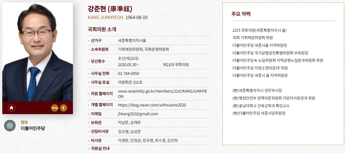 안녕하세요 여러분~ 제 21대 국회의원 세종시 을 선거구 더불어민주당 소속 강준현 후보입니다. 저는 현재 대전지방법원 판사 출신 변호사로서 법무법인 유앤아이 대표변호사로 활동하고 있으며, 지난 2016년 총선 때 국민의당 비례대표 공천을 받아 정치권에 입문했습니다. 이번 선거에서는 지역구 출마를 결심하게 되었습니다.